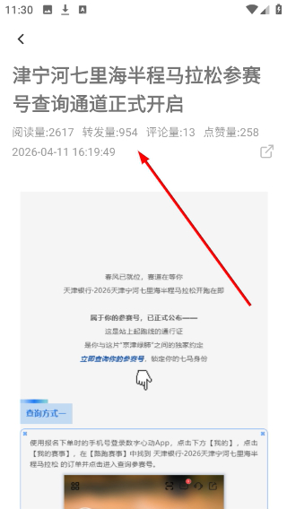 4、進入資訊詳情頁可完整閱讀文章內容,查看閱讀轉發(fā)評論等互動數據與資訊詳情。