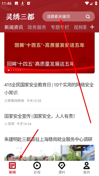 1、進入靈繡三都首頁,點擊頂部搜索欄輸入關(guān)鍵詞,可快速查找本地新聞與相關(guān)資訊。